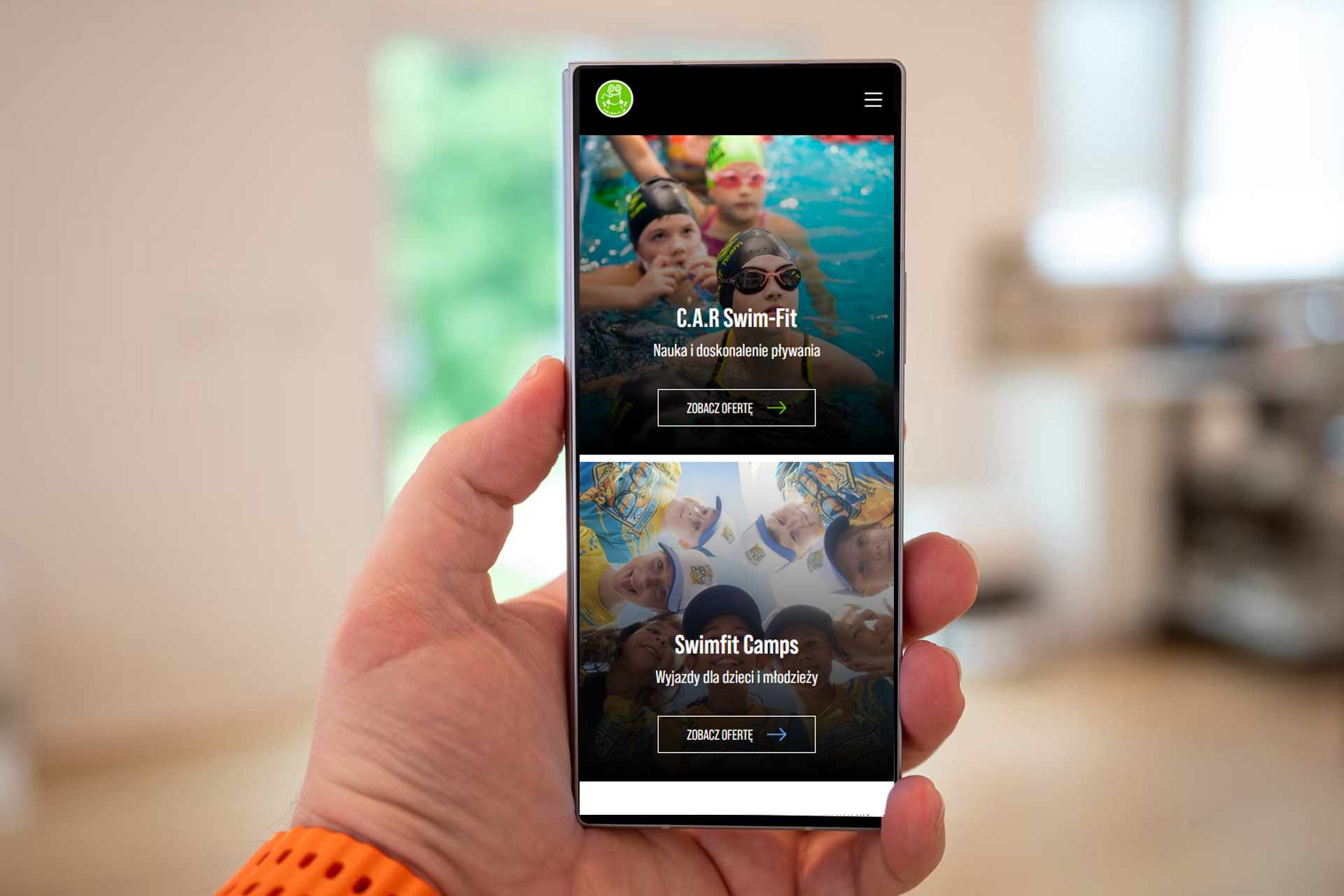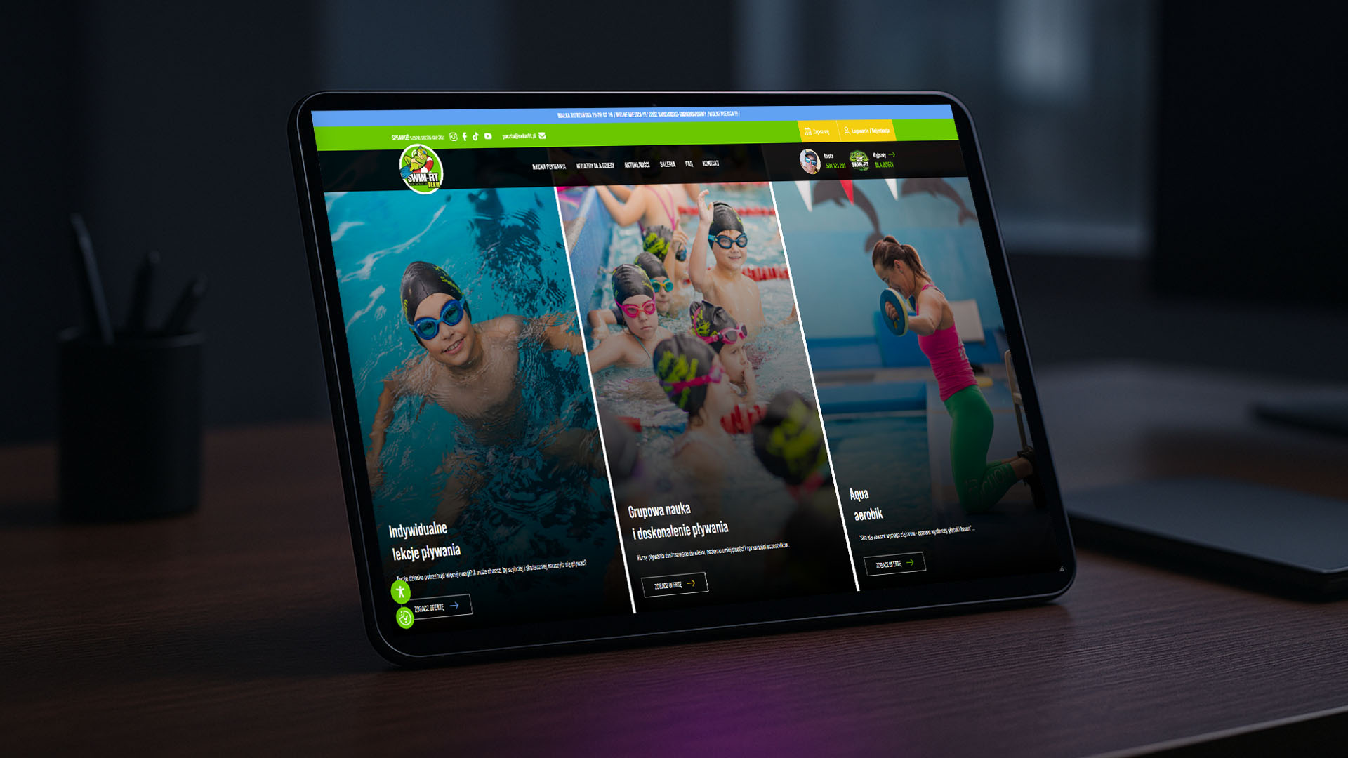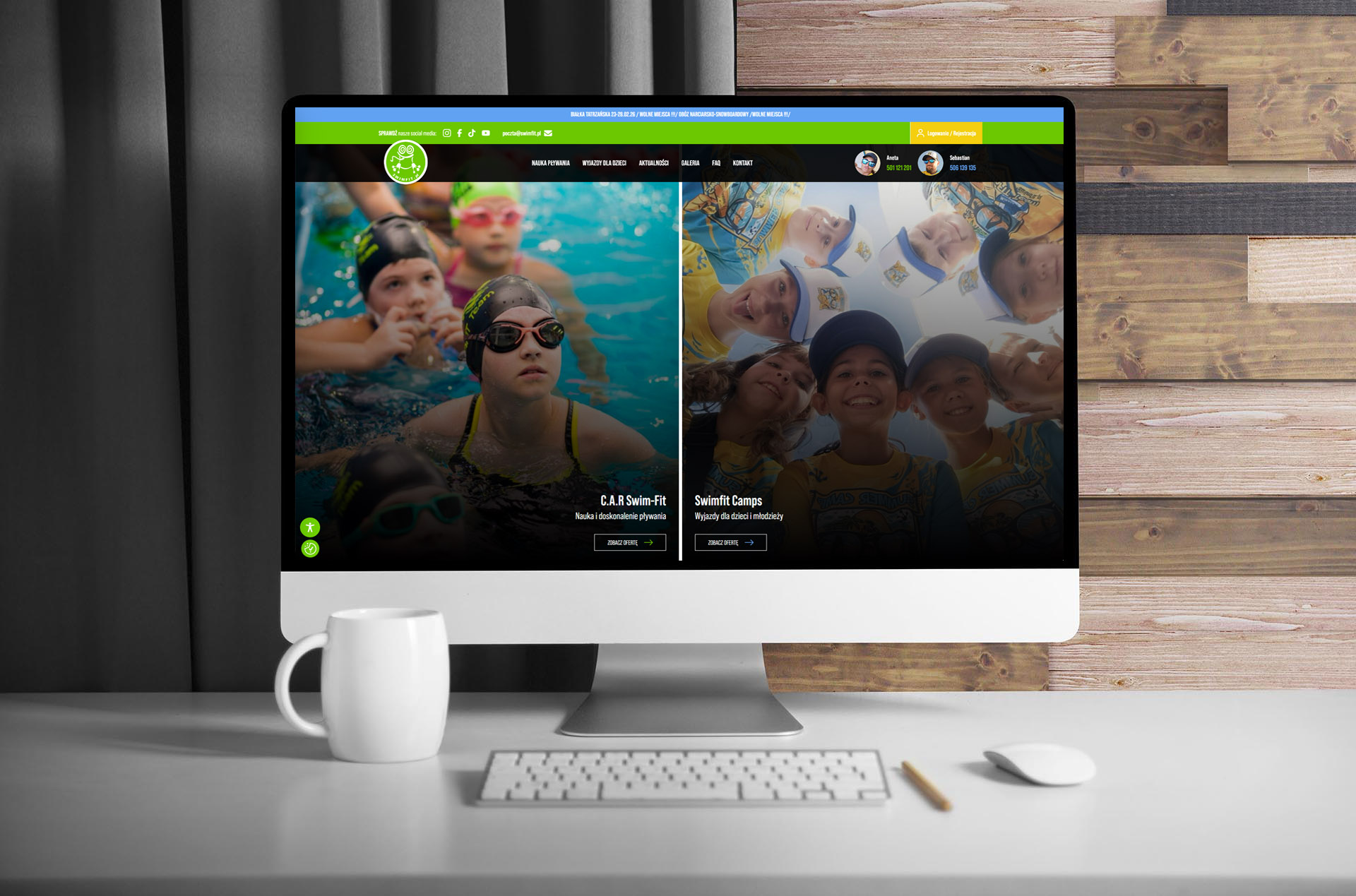 Strona www dla firmy Swimfit. Jest to rozbudowany serwis internetowy wraz ze sklepem online, który umożliwia zakup lekcji pływania oraz wycieczek sportowych bezpośrednio przez stronę. Platforma została zaprojektowana w sposób intuicyjny, tak aby klienci mogli w prosty sposób przeglądać ofertę i dokonywać rezerwacji lub zakupu usług.